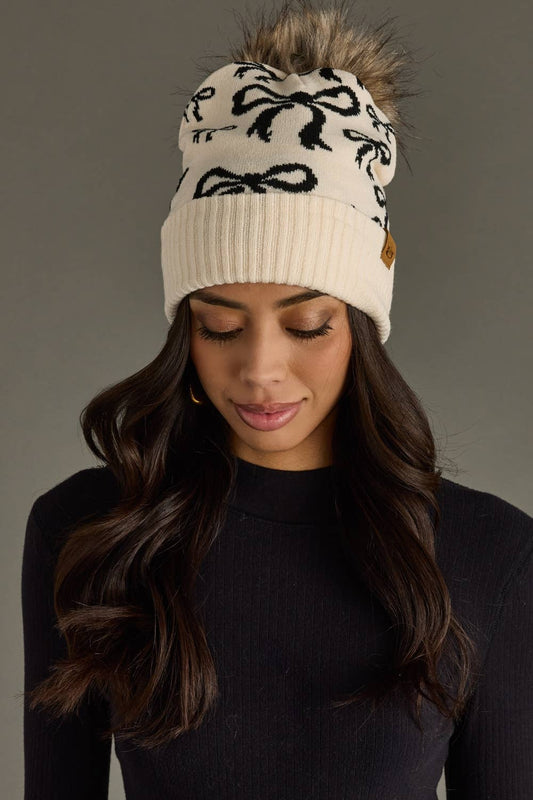 Beige & Black Bow Pom Hat