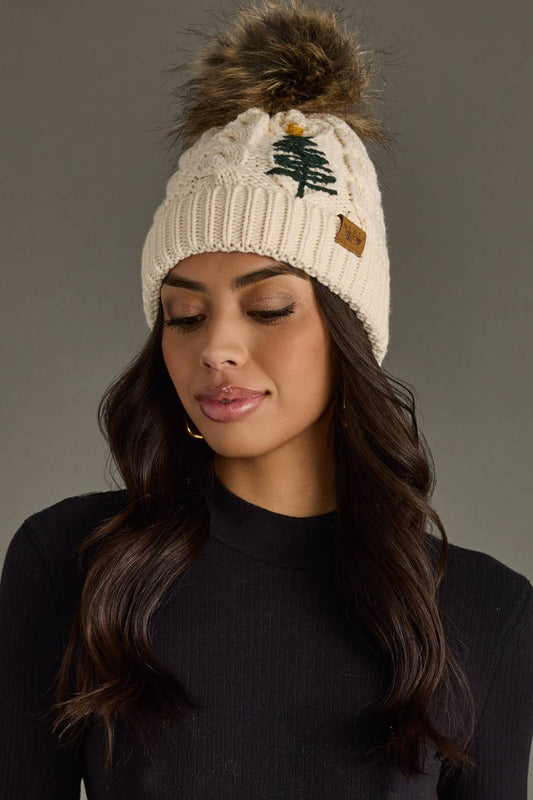 Beige Cable Knit Pom Hat w/ Embroidered Tree