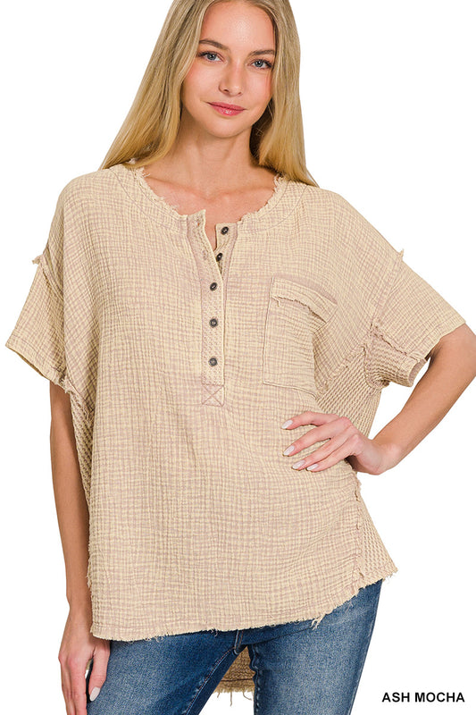 WASHED DOUBLE GAUZE 3/4 BUTTON HENLEY NECK TOP