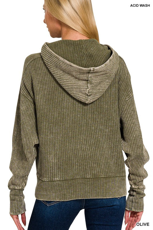 ACID WASH COTTON WAFFLE HOODED ZIP-UP JACKET
