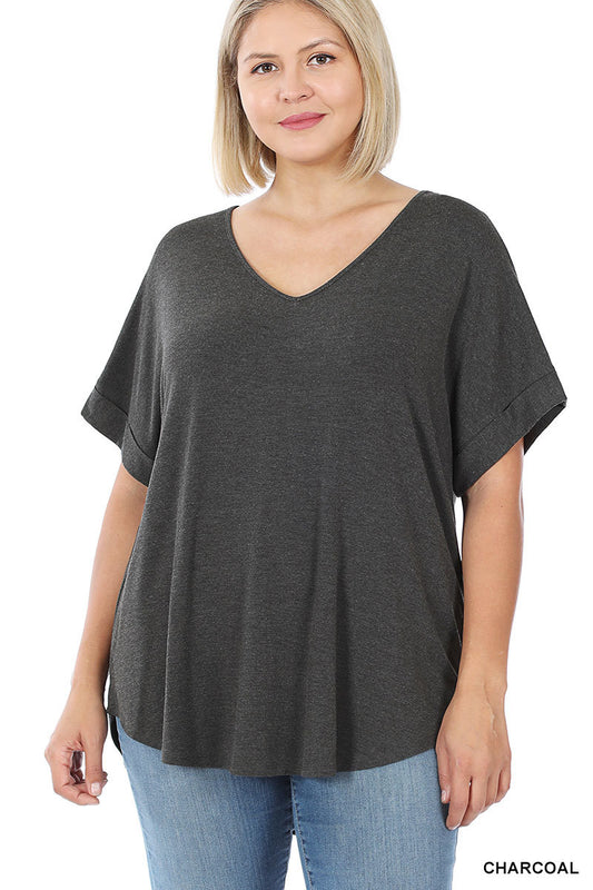 LUXE RAYON SHORT CUFF SLEEVE V-NECK TOP