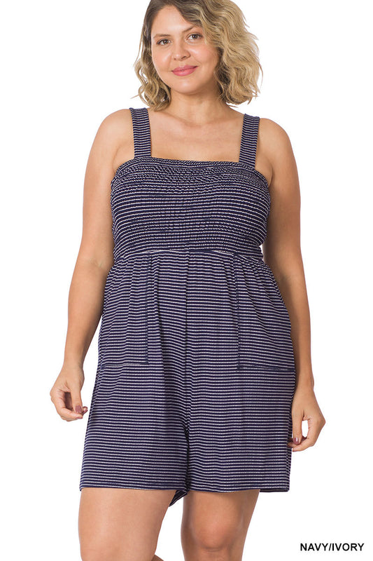 SMOCKED TOP STRIPED ROMPER WITH POCKETS