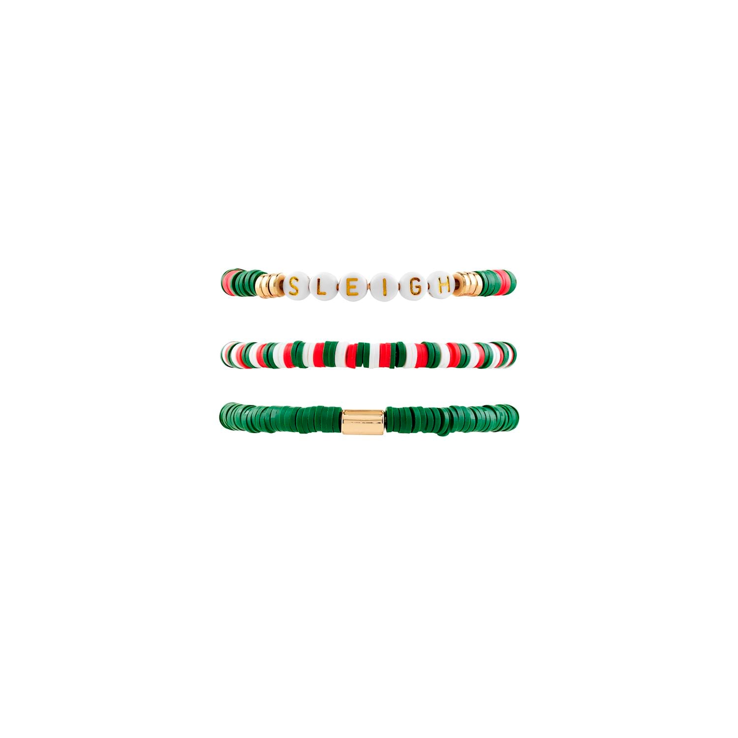 Set of three elastic stretch bead bracelets feature "HO HO HO," "SLEIGH" or "NAUGHTY" phrase.