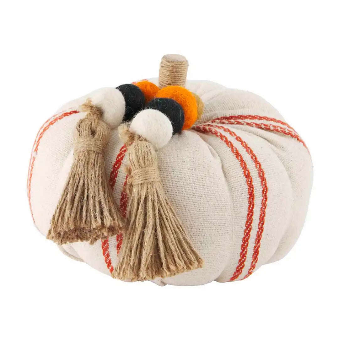 The perfect pumpkin does exist, and it's this Small Grain sack Pumpkin. The grain sack pumpkin features jute wrapped stem. The stem features a felted wool pom and jute tassel accent - featuring black, orange and white poms. The pumpkin features a white and orange striped pattern.
