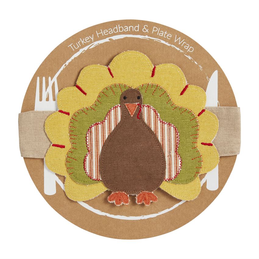 Embroidered canvas turkey fits around standard size dinner plate for a festive Thanksgiving table setting that doubles a fun headband. Adjusts to fit child or adult.